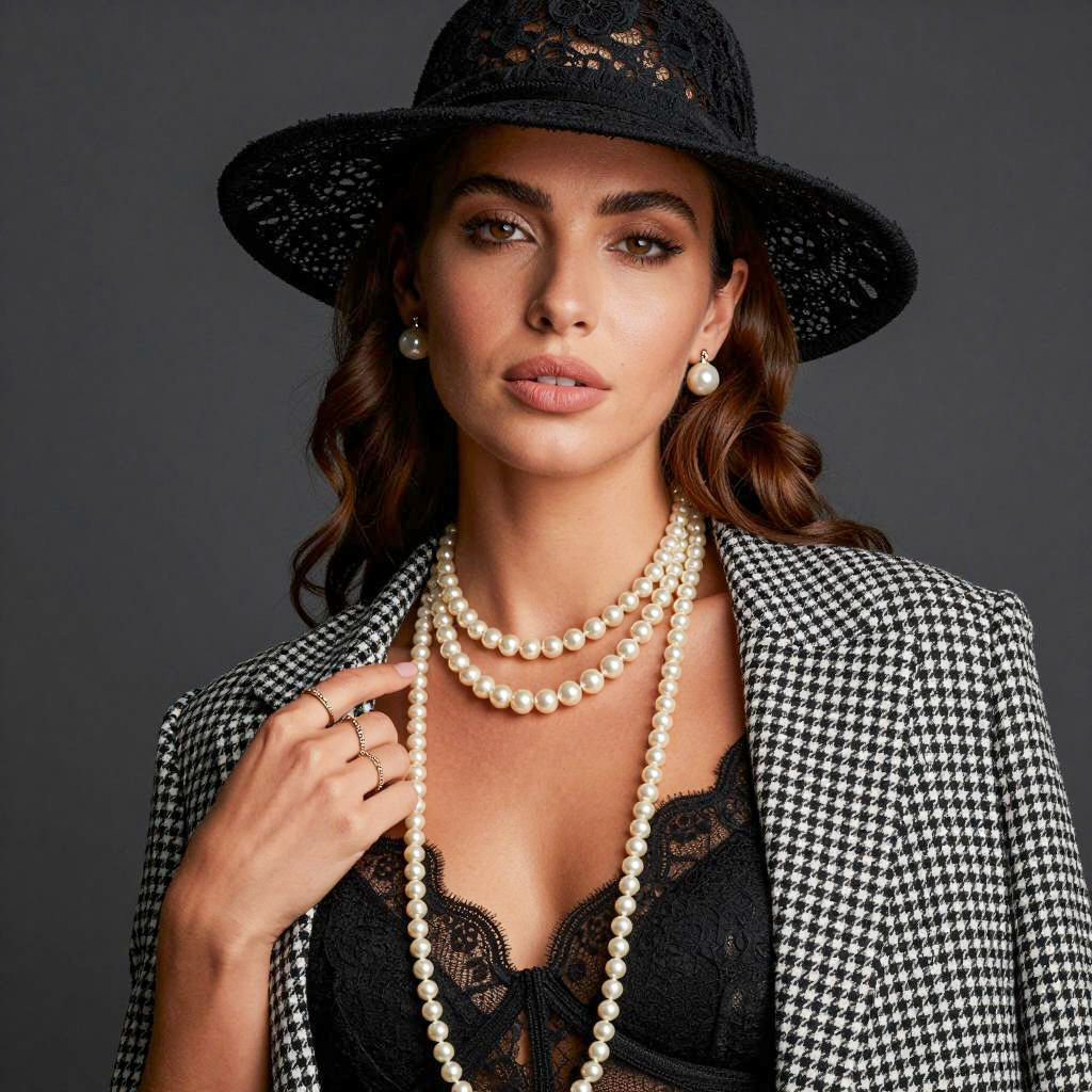 Photograph of a woman with light skin, blonde hair, and intense gaze. She wears a large black hat, black sheer polka-dotted gloves, a black velvet robe, and a chunky silver necklace. She has her hands near her face, red-painted nails visible. A clear wine glass is on the table to her right. She is seated indoors with a blurred background.