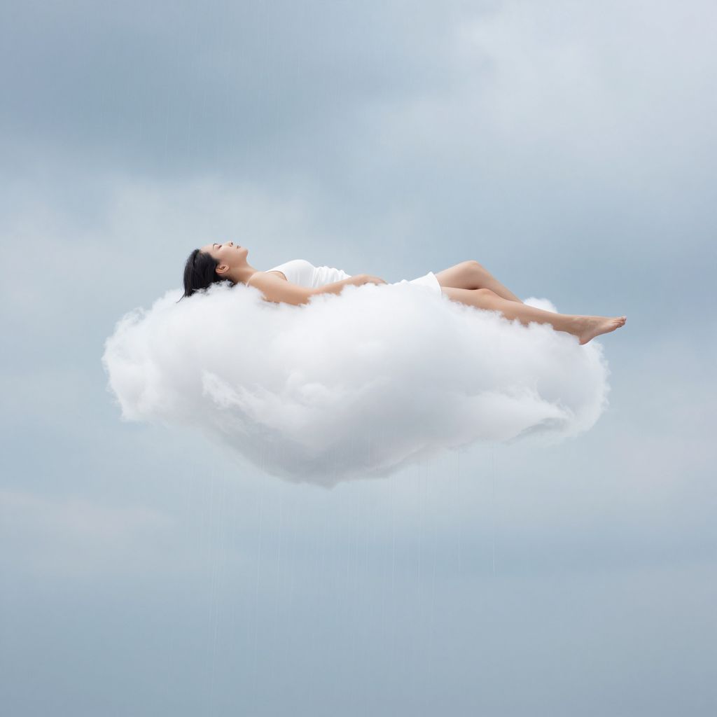 A digital illustration depicts a nude Asian woman with black hair floating serenely on a white, fluffy cloud against a light blue, slightly cloudy sky. She lies on her back with eyes closed, arms and legs relaxed, exuding tranquility. Her smooth, light brown skin contrasts with the cloud's soft texture. She wears only black flip-flops, and her body is partially shadowed by the cloud. The minimalist background emphasizes her peaceful, ethereal state. The image combines realism with a dreamlike quality, focusing on the contrast between her form and the cloud.