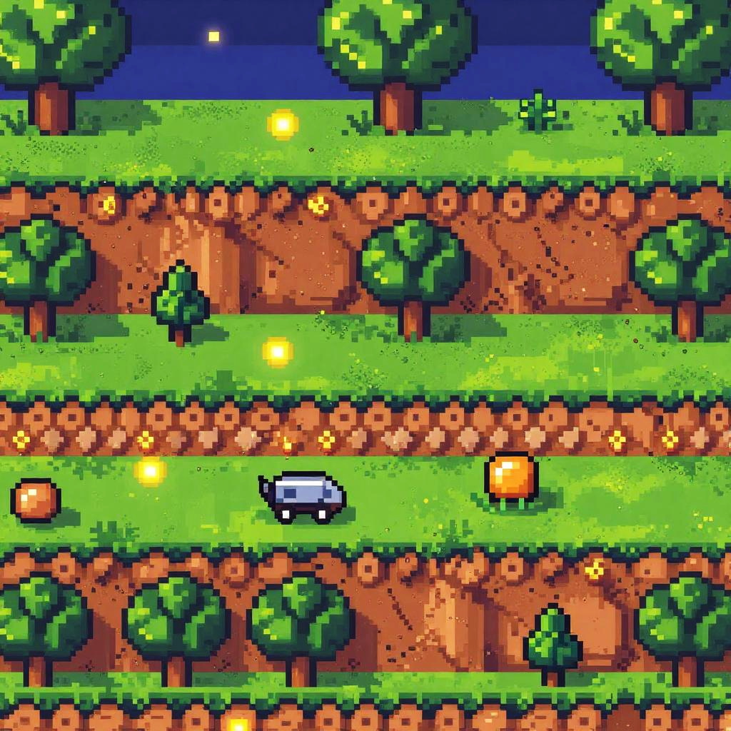 Pixel art upscaler AI enhancing classic game scenes, turning rough pixelated landscapes into detailed, colorful environments, filled with lush greenery, glowing lights, and crisp textures, evoking a futuristic yet vintage pixel universe.