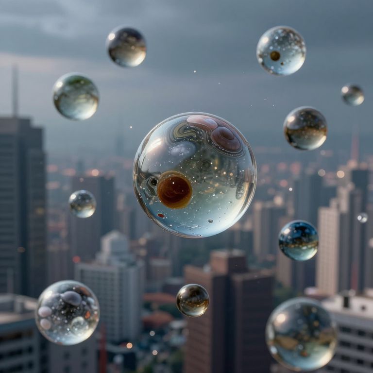Photograph of clear, glass-like bubbles with reflective surfaces floating in mid-air against a blurred urban skyline. The bubbles vary in size, with some showing internal patterns and colors, including brown and purple swirls. The background features tall, modern skyscrapers in shades of grey and blue, with a cloudy, overcast sky above. The bubbles are positioned at various distances and angles, creating a sense of depth. The image combines the delicate, translucent quality of the bubbles with the sharp, contrasting lines of the cityscape below.