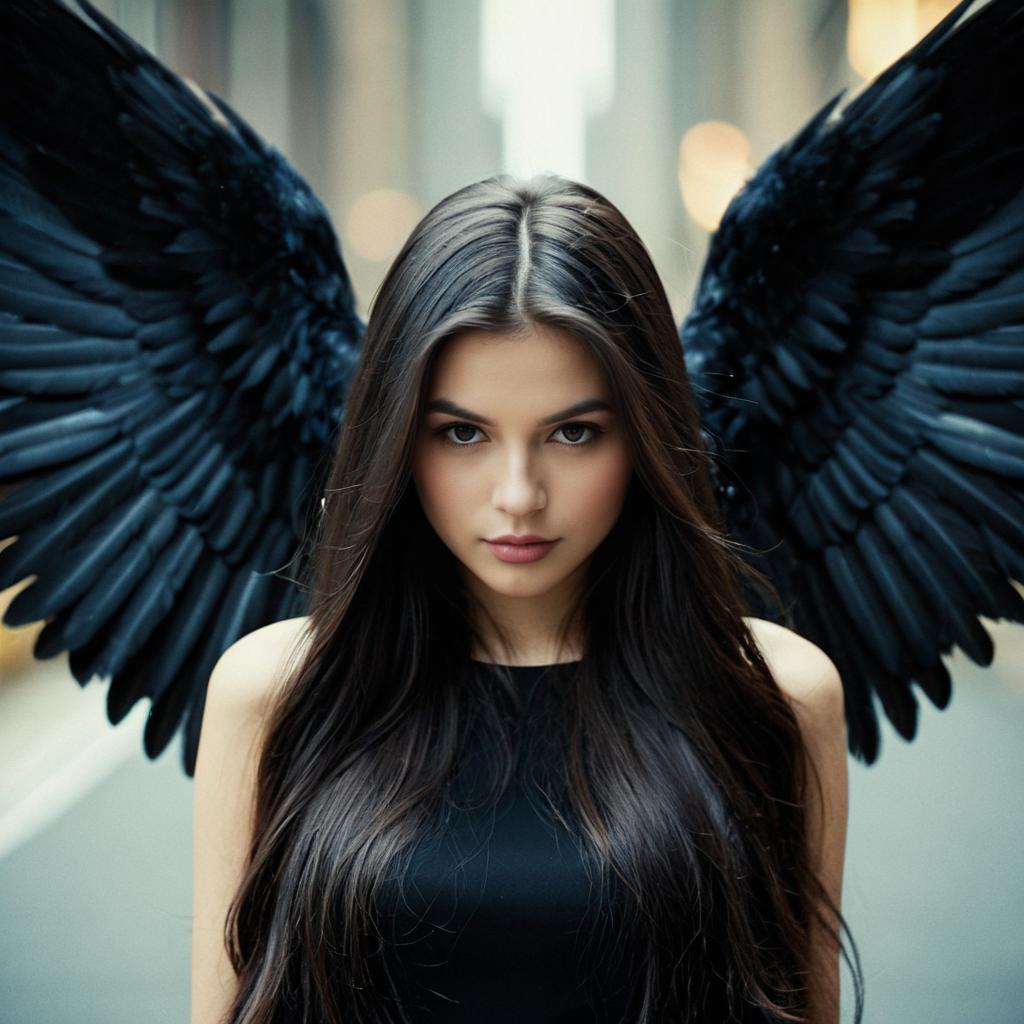 Fallen angel headpiece,1girl, solo, wings, realistic, brown hair, looking at viewer, angel wings, short hair, angel, feathered wings, blurry, brown eyes, upper body