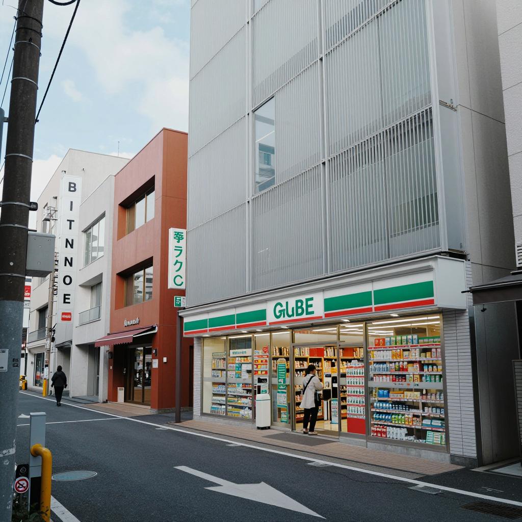 Bold Lines Capture a photograph of a modern street in Japan during the daytime that features drug stores. Look for a location where the street showcases modern architecture, colors, and character, and where the drug stores stand out and are easily visible. Use your cameras framing and composition techniques to create an interesting and dynamic image that showcases the unique features of the street and its drug stores. Pay attention to the surrounding details, such as people, street elements, and other businesses, that can help to create a sense of place and context. Consider the lighting and weather conditions, as these can have a significant impact on the mood and overall feeling of the image. Finally, aim to capture an image that is clear, sharp, and visually appealing, showcasing the modernity and vibrancy of the street and its drug stores.,