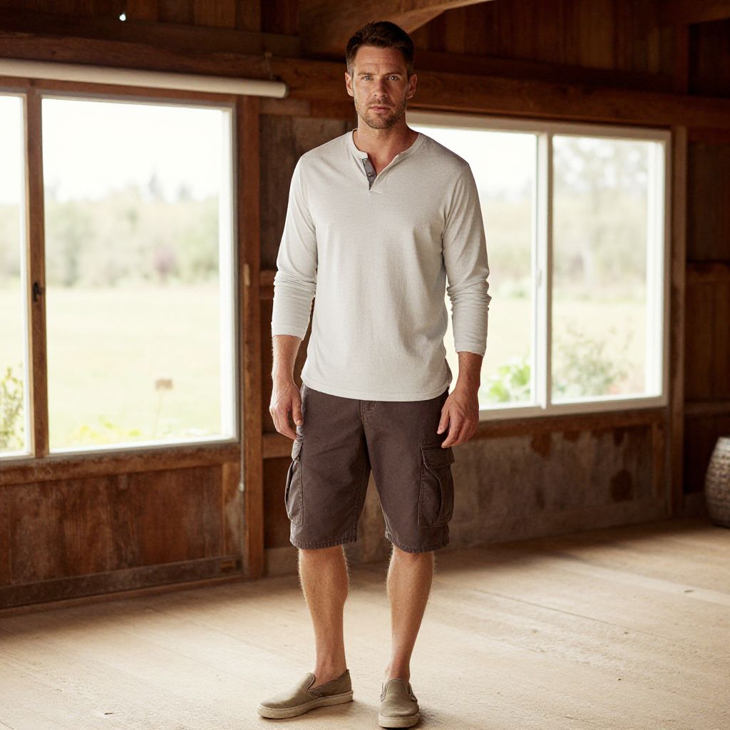 A man, light gray long sleeve henley, dark brown cargo shorts, canvas slip-ons, rustic barn, wooden beams, large windows overlooking a garden, soft focus, warm tones, relaxed expression. Man has masculine face and piercing eyes