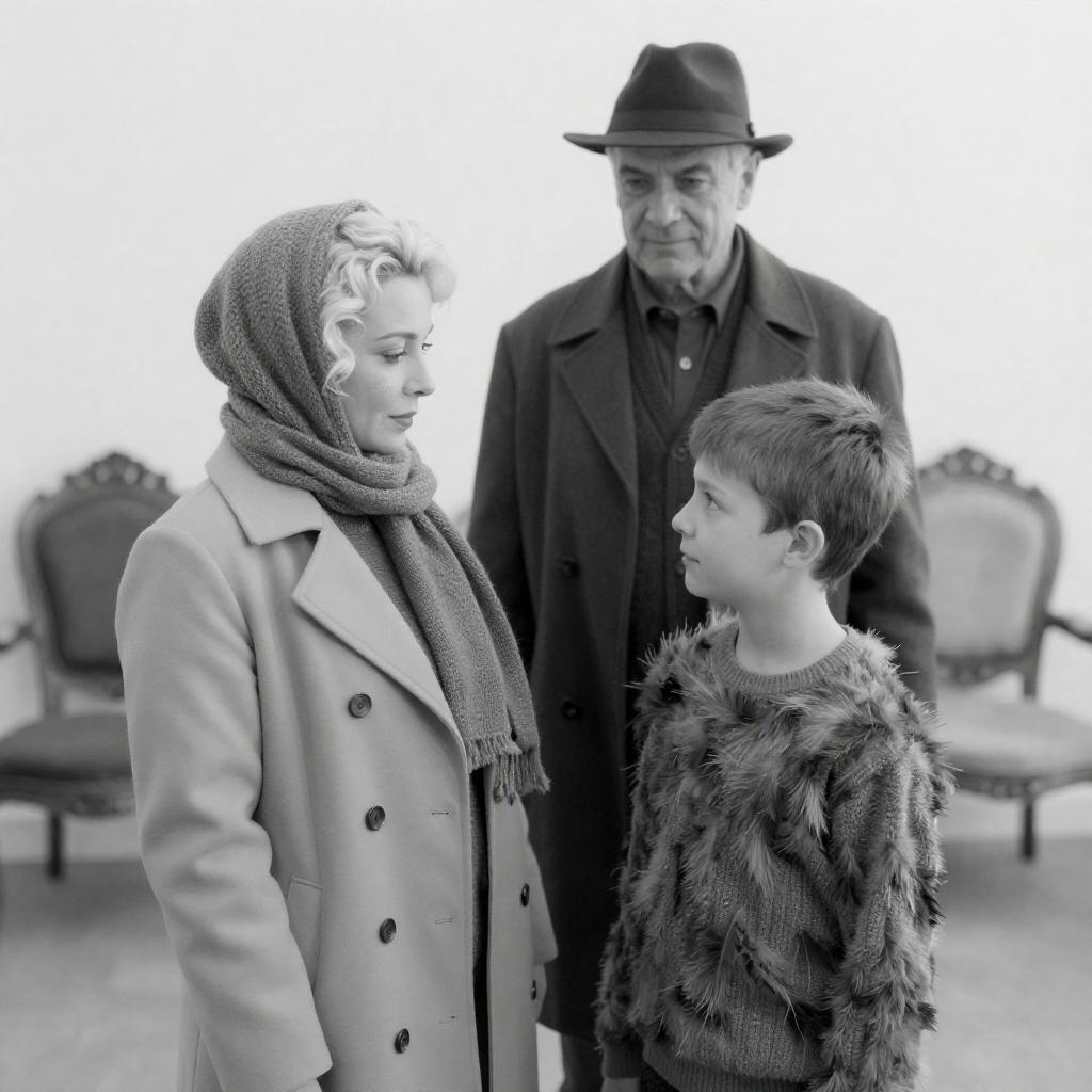 Black-and-white photograph of three people. Blonde woman with curled hair, wearing a knitted headscarf and coat, looks at boy with short hair in feathered shirt. Older man in hat and coat stands behind them. Ornate chairs in background.