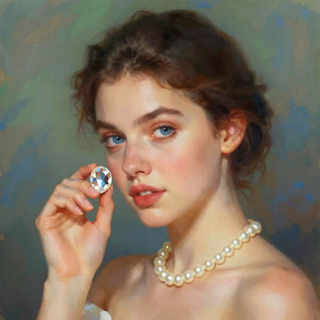 This is a digital art portrait of a fair-skinned woman with blue eyes and dark brown hair tied back. She's wearing a pearl necklace with a large, faceted, crystal pendant that she's holding near her face with her right hand. The background is a blend of green and blue, giving a soft, painterly effect. Her expression is gentle and slightly flirtatious.