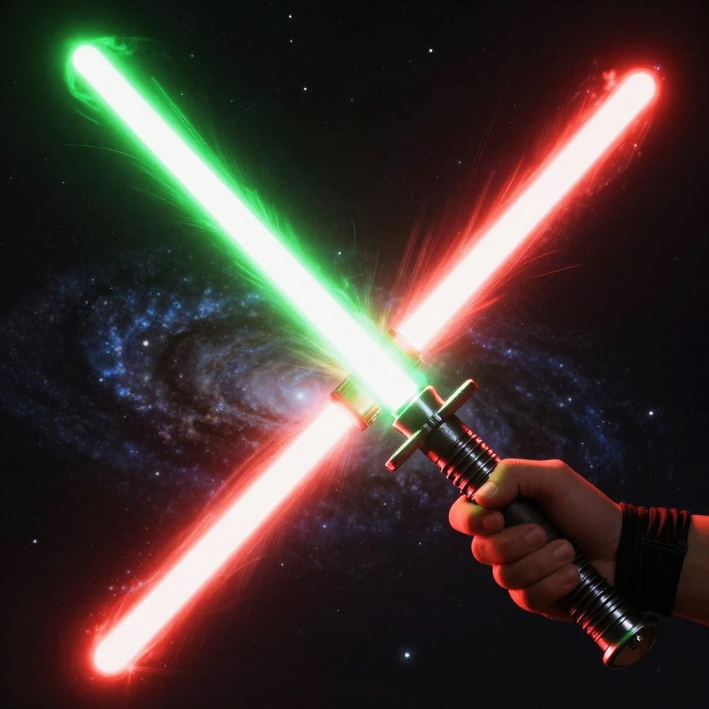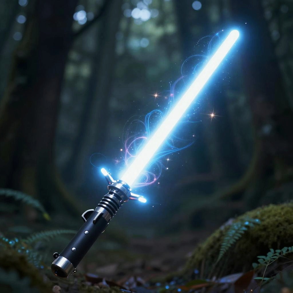 Light saber image with a detailed hilt, bright blue blade emitting radiant light, Jedi warrior silhouette in the background, epic battle scene at sunset