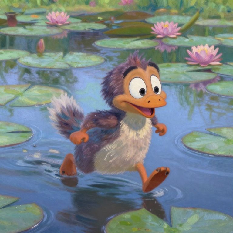 Cartoon duck-like character with fluffy gray and white feathers joyfully runs through a colorful, lily-pad-filled pond with pink lotus flowers.