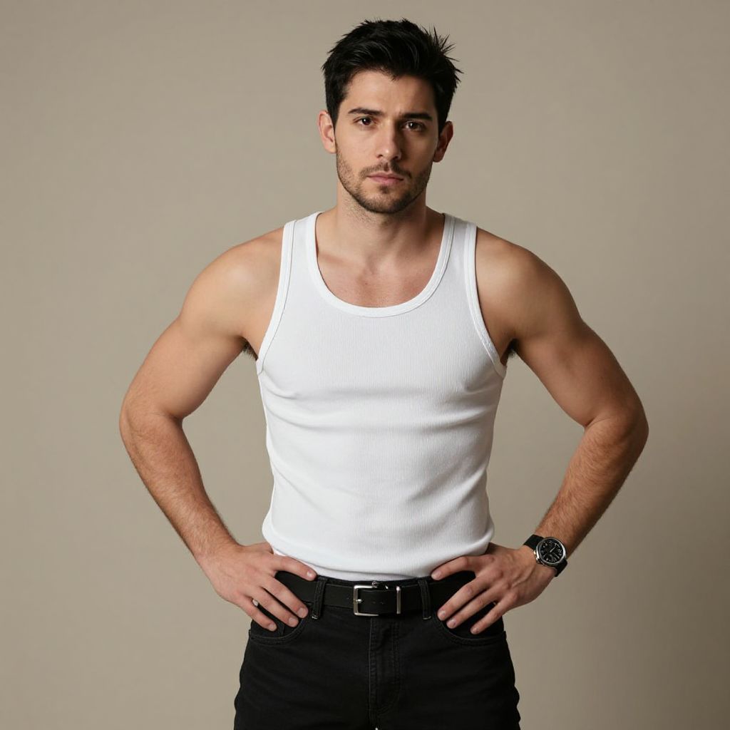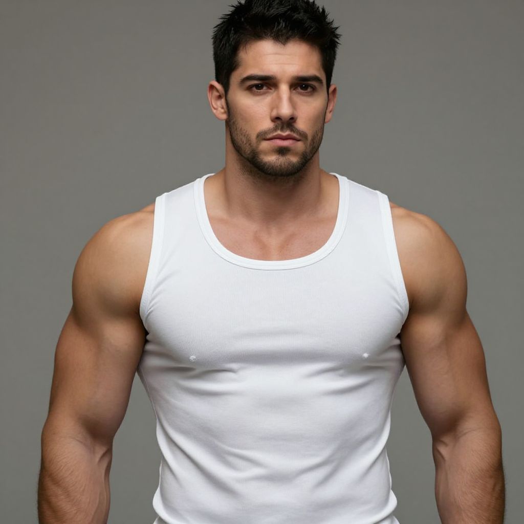 Photograph of a muscular, handsome man with short dark hair, light stubble, and intense gaze, wearing a tight white tank top against a gray