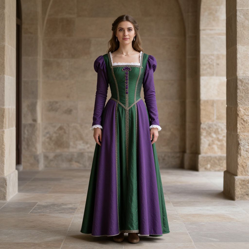 Green And Purple Medieval Dress, a woman in a green and purple dress standing in a building