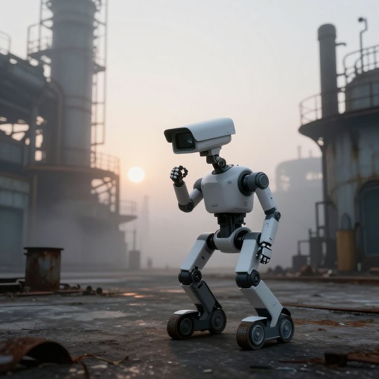 Surveillance robot patrolling a deserted industrial complex at dawn, with mist swirling around rusty metal structures, conveying a sense of isolation and futuristic vigilance in a post-apocalyptic environment.