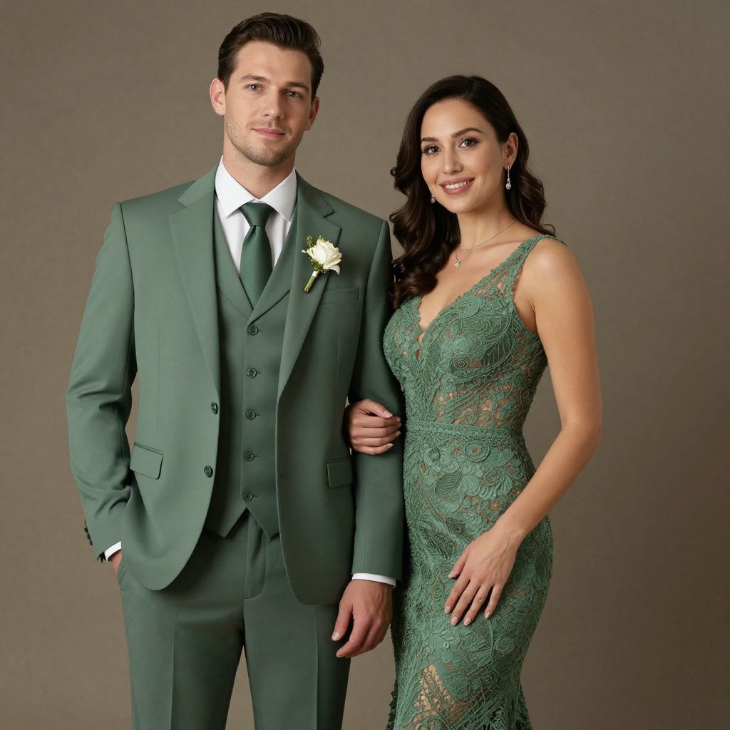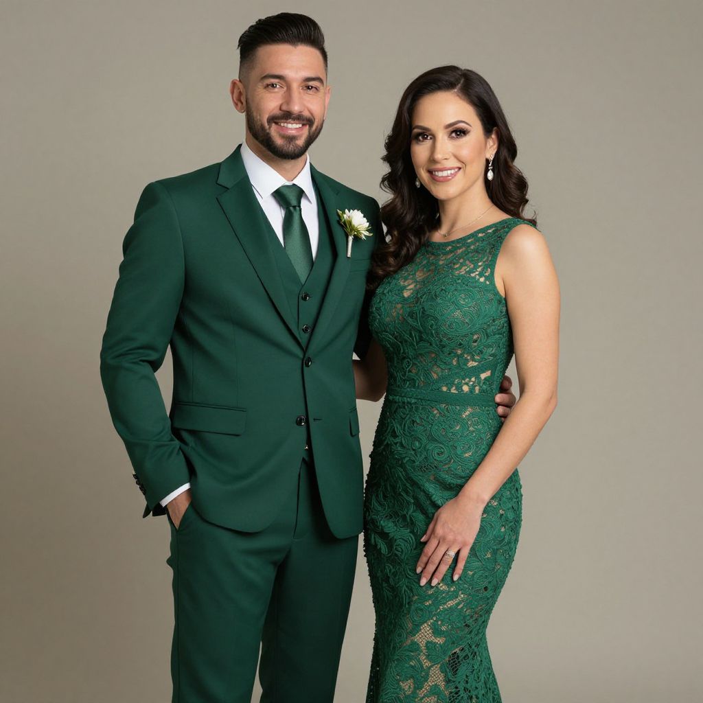 Elegantly dressed couple in matching green ensembles pose together, with the man in a three-piece suit featuring a boutonniere and the woman in a form-fitting lace gown, both smiling warmly against a neutral backdrop.