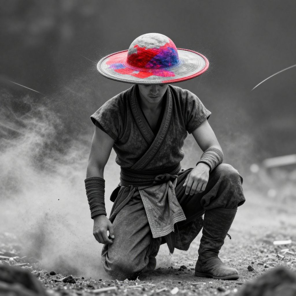 Photograph of a muscular male ninja crouching in a dusty, rocky landscape. He wears a wide-brimmed hat with a vibrant red and blue pattern, a dark, tattered short-sleeve shirt, and pants tied with a cloth belt. His arms are wrapped in dark bands, and he wears sturdy boots. The background is blurred, with swirling dust and dark, indistinct foliage. The image has a dramatic black-and-white style with selective color on the hat, emphasizing its brightness against the muted surroundings. The ninja's intense expression and crouched position suggest readiness or focus.