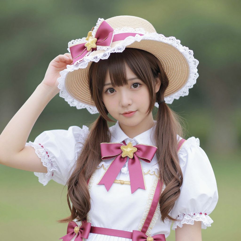 Photograph of an Asian woman with fair skin and long brown hair in pigtails, wearing a white, short-sleeved, lace-trimmed blouse with a large pink bow and gold star brooch. She has a wide-brimmed straw hat adorned with a pink bow and lace trim, which she is adjusting with her right hand. She is also wearing pink suspenders over her blouse. The background is softly blurred greenery, suggesting an outdoor setting. The overall style is cute and kawaii, with a focus on delicate, pastel colors and intricate details.