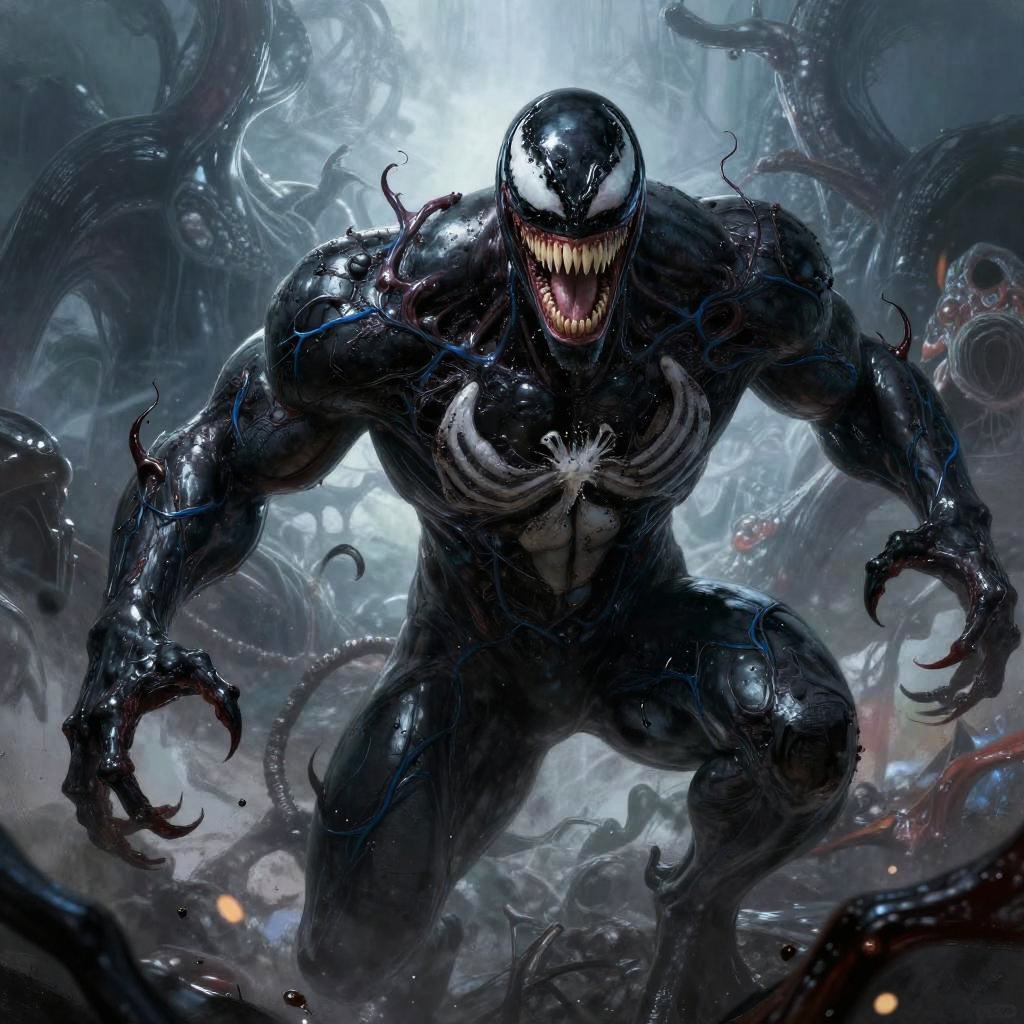 Venom full body in mid-transformation, symbiote symbiotically merging with host body, black organic textures pulsating with blue veins, fierce expression with glowing eyes, surreal and energetic background evoking chaos, detailed digital painting.