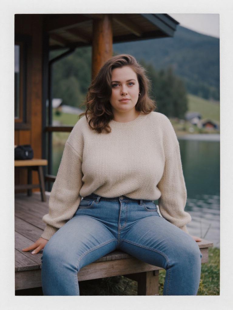 A lanky woman in a cozy oversized beige sweater and blue stone-washed skinny jeans, captured in the style of a Kodak SP analog photo, sitting on the porch of a mountain cabin by a serene lake. Sexy. Pretty face and beаutiful eyes. Big breasts