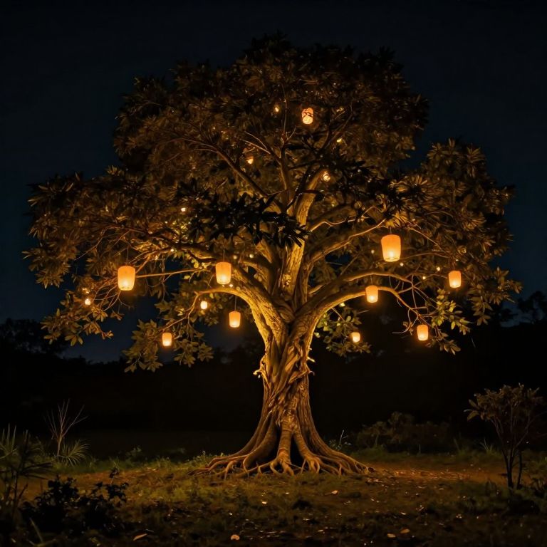 In a nocturnal realm where gravity bends and dreams take root, a luminous tree stands as a beacon of hope, its branches adorned with floating lanterns that cast a warm, ethereal glow, inviting contemplation amidst the quiet whispers of the night.