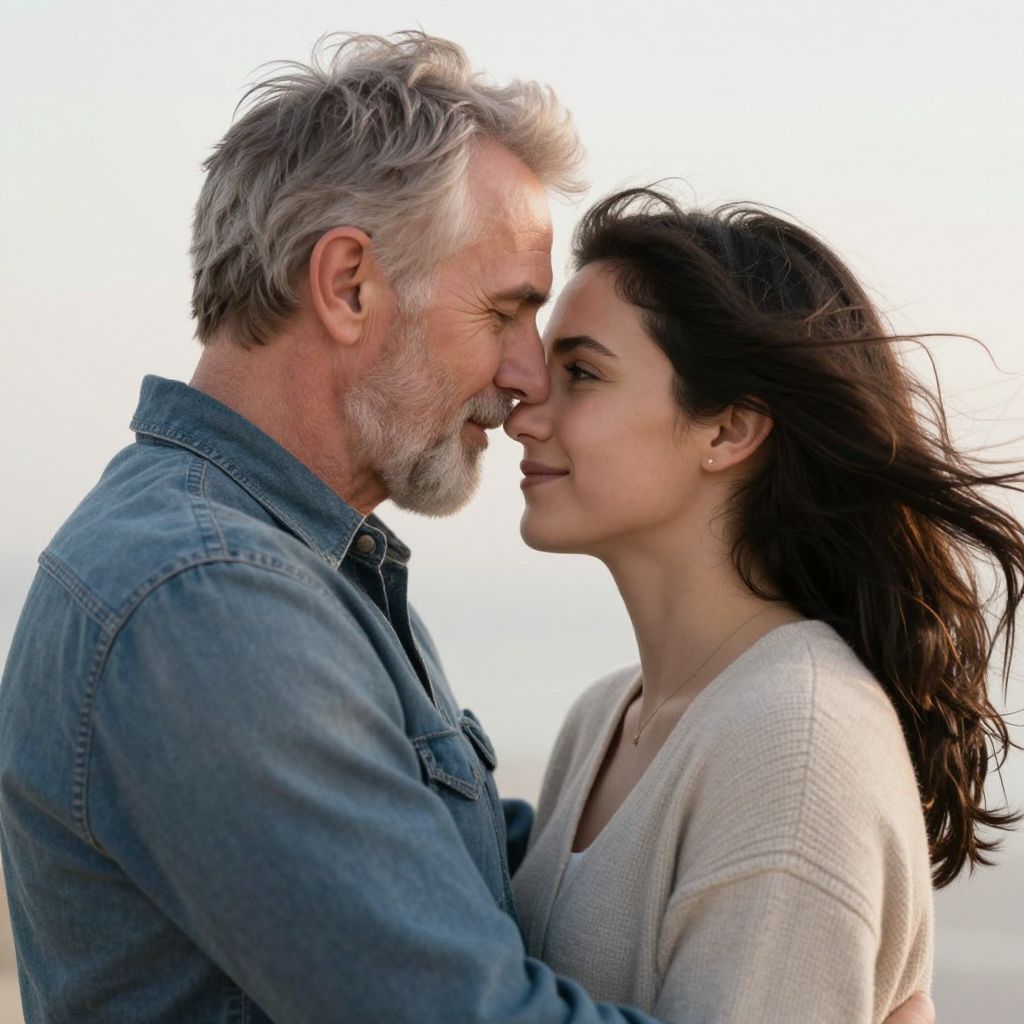 A tender moment captured in a high-definition 3D render, showcasing an older man with gray hair and a beard gently embracing a younger woman with flowing dark hair, her face illuminated by soft, natural lighting that enhances the emotional depth of their interaction.