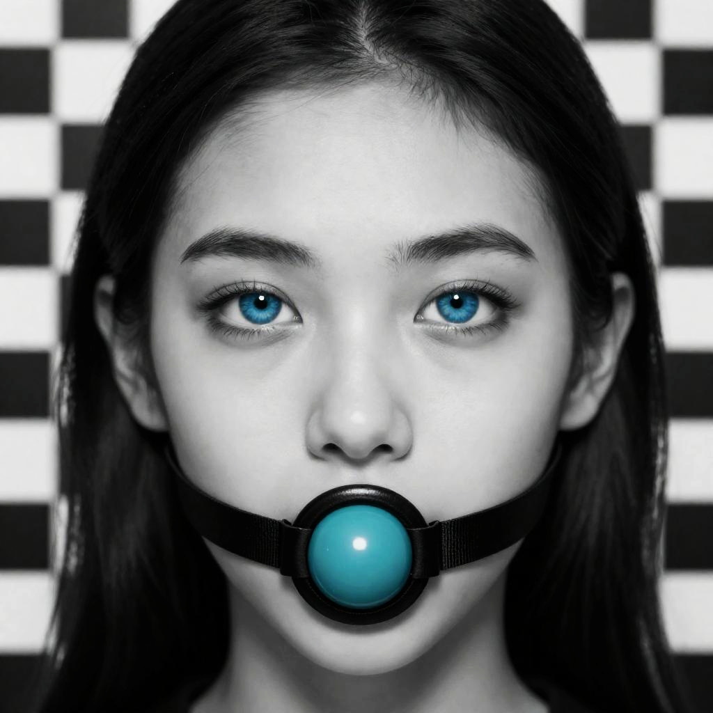 This is a digital artwork featuring a close-up of a woman's face with striking blue eyes and black-and-white color scheme. She has dark hair and is wearing a black ball gag with a teal center in her mouth. The background is a black-and-white checkerboard pattern that creates a hypnotic effect, drawing attention to her intense gaze. The overall style is surreal and edgy.