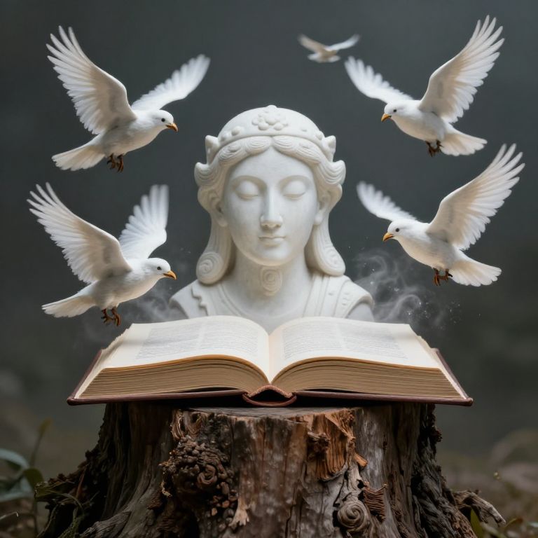 Photograph of a white stone statue of a serene-faced woman with wavy hair, eyes closed, sitting atop a weathered tree stump. An open book rests in front of her, with wisps of steam rising. Surrounding the statue are six white doves with outstretched wings, flying in a circular pattern. The background is a dark, blurred gradient, emphasizing the bright white of the statue and birds. The doves' feathers are detailed, and the book's pages are slightly curled. The image has a surreal, ethereal quality.