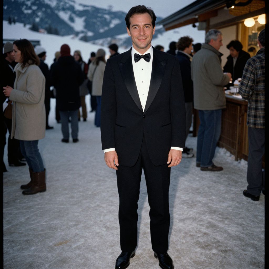 A man, classic black tuxedo jacket, peak lapels, white pleated dress shirt, black silk bow tie, black dress trousers, black leather oxfords, bustling après-ski scene, lomography analog photo, confident smile, warm ambiance. Man has masculine face and piercing eyes
