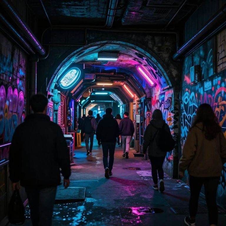 Underneathe a bustling city street, a secret underground tunnel system filled with neon graffiti, flickering lights, and shadowy figures, combining cyberpunk aesthetics with gritty urban textures, dynamic and atmospheric.