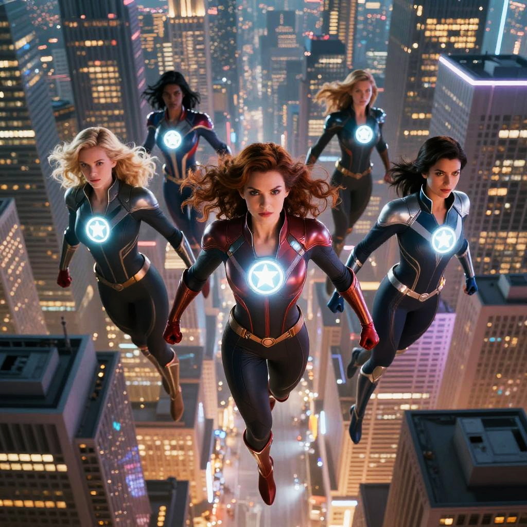 Superheroines in mid-flight above a sprawling metropolis, powerful and determined expressions, sleek costumes with glowing emblems, neon lights reflecting off skyscrapers, cinematic lighting, dynamic composition, comic art style.