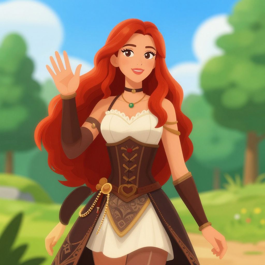 A vibrant digital illustration of a woman with long, flowing red hair, elegantly dressed in a beautifully detailed outfit. She stands in a picturesque outdoor setting, waving at the viewer with a friendly expression, surrounded by lush greenery and a bright blue sky.