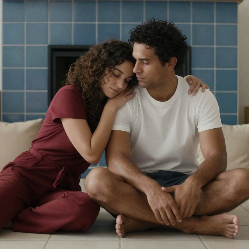 Photograph of a man and woman sitting on a tiled floor. Man with curly dark hair, white t-shirt, muscular build, arms around woman. Woman with curly brown hair, red shirt, red pants, face close to man's shoulder, arms around man. Background: blue-tiled wall, black fireplace, beige pillows. Man's expression: focused, slightly serious. Woman's expression: affectionate, soft. Number of people: 2. Interaction: intimate, affectionate.
