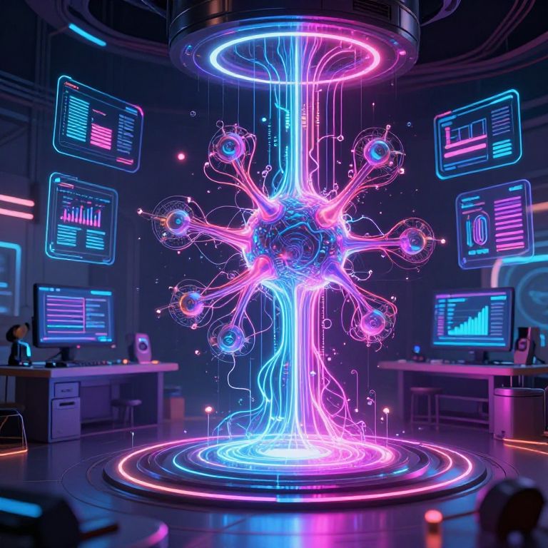 Neon-lit, futuristic lab with glowing, DNA-like central structure and holographic screens. Vibrant pink, blue, and purple lights illuminate the