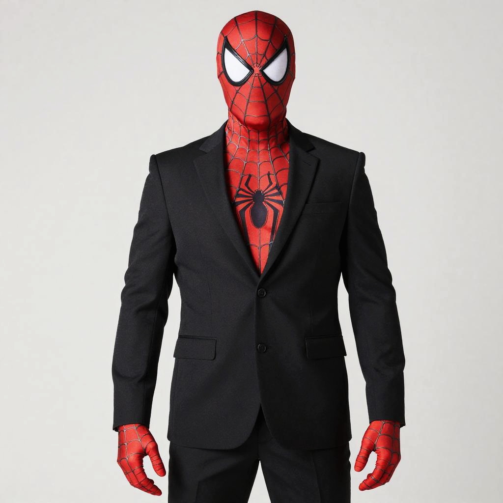 A man dressed in a red Spider-Man spandex costume partially covered by a stylish black business suit. The combined outfit features the iconic spider emblem on the chest and web pattern on red fabric, contrasted with a formal black blazer and matching pants. The image is set against a plain light background.