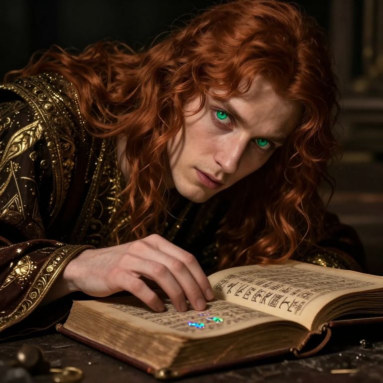 Imagine a captivating portrait reminiscent of Rembrandt's renowned works, depicting an enchanting figure with captivating emerald eyes and lustrous chestnut hair leaning in close, his hand poised over an ancient tome as he studies something intriguing on the ground below. The scene is captured from a distinct low-angle perspective, revealing intricate details like the gleaming gold threadwork adorning his flowing garments and the iridescent glyphs etched into the book's leather-bound cover. As the soft light casts dramatic shadows across his features, it highlights his piercing gaze and creates an emotional gradient that evokes intrigue and wonder in this mysterious encounter with a powerful sorcerer engrossed in thought.