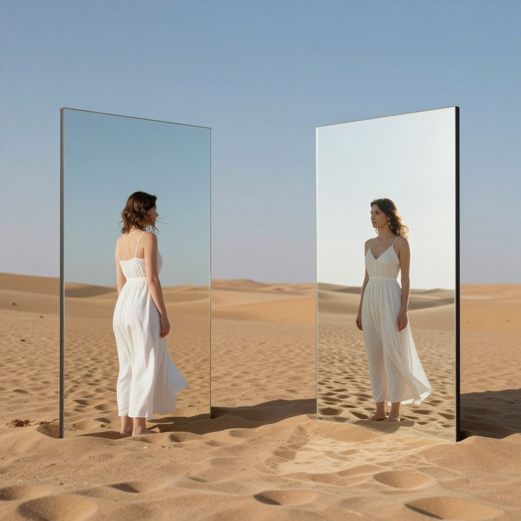 Two identical mirrors embedded in a sandy desert landscape reflect mirror images of a woman in a white dress, symbolizing parallel realities or alternate paths in life.
