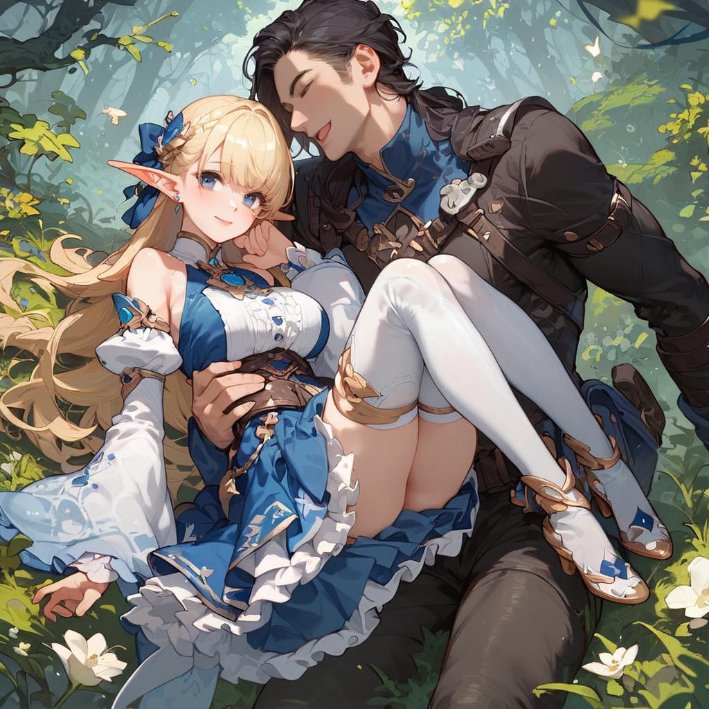 This digital anime-style illustration depicts a blonde, blue-eyed elf woman with pointed ears, wearing a blue and white frilled dress with detached sleeves, white thigh-high stockings, and blue shoes, being gently carried by a dark-haired, blue-eyed man in a black, ornate jacket. The man's hand rests on her thigh, and she has a soft, coy smile, looking into his eyes. They are surrounded by lush green foliage and sunlight filtering through the trees, creating a serene, romantic forest setting. The man's expression is affectionate, and the overall composition exudes a sense of tender intimacy.