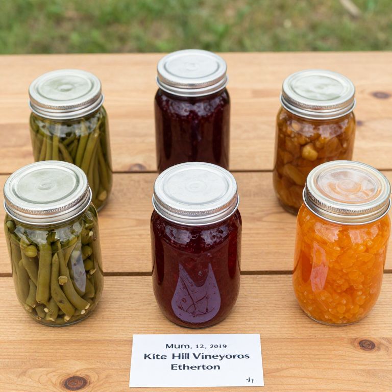 Wooden table displays seven Ball jars containing colorful preserved goods, including green beans, red jam, and orange marmalade, arranged neatly for an Intro To Canning demonstration held on Monday, Aug. 12, 2019, at Kite Hill Vineyards in Etherton.