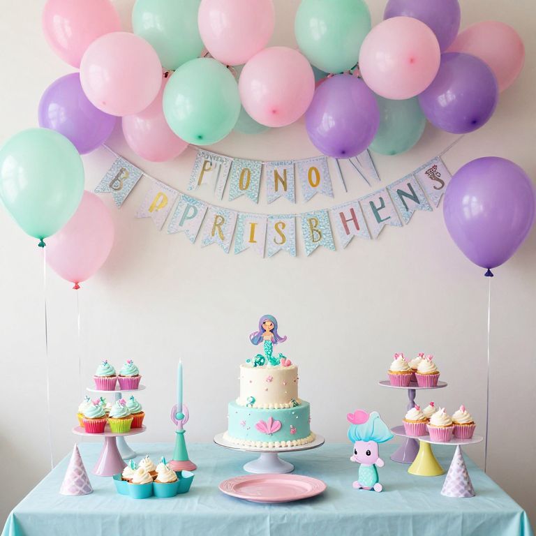 Mermaid-themed baby shower setup featuring a pastel-colored table adorned with a two-tiered cake, colorful cupcake stands, festive bunting banners reading \"POMENIOR BOPRINTINS BLEEDSBTHPN,\" and a backdrop of balloons in shades of pink, green, and purple, creating a whimsical and cheerful atmosphere.