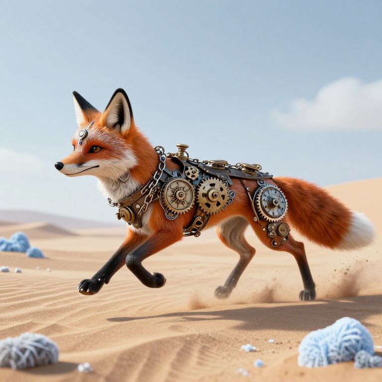 A steampunk-inspired 3D render depicts a clockwork fox adorned with intricate mechanical gears and chains, sprinting across a surreal desert landscape where sand and frost coexist, evoking a sense of frozen time and suspended motion.