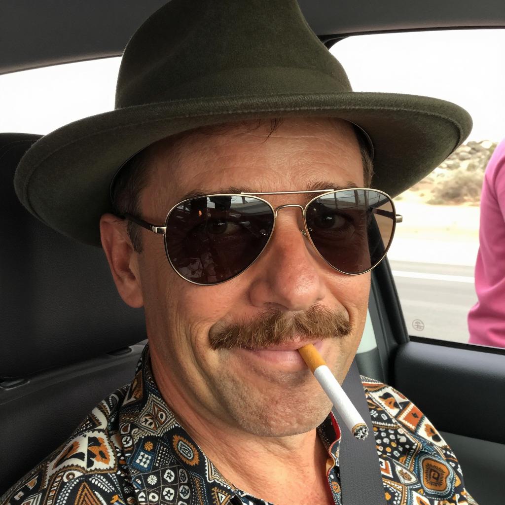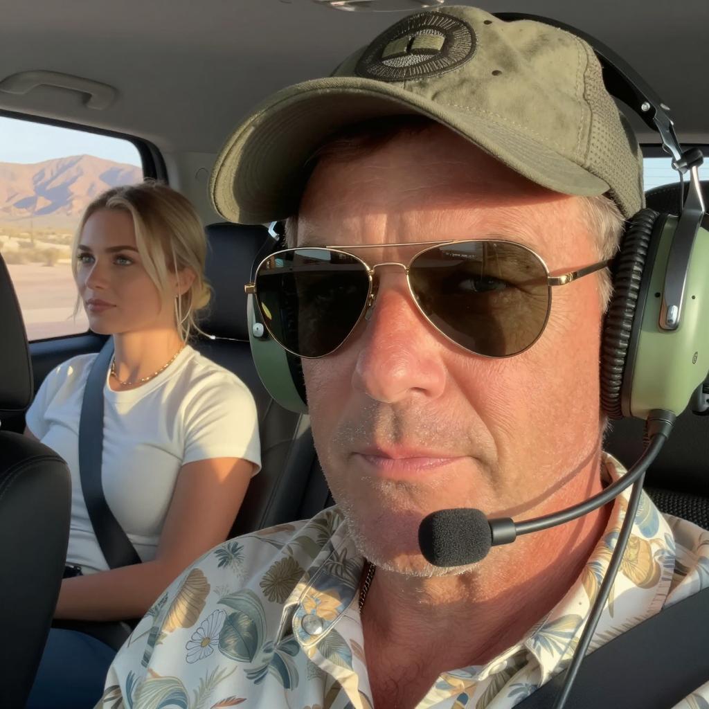Close-up of a man with light skin, wearing large gold aviator sunglasses, a green bucket hat, and a patterned shirt. He has a headset with a microphone on his left cheek. In the background, a blonde woman with light skin sits in a car, wearing a white shirt. Desert landscape with mountains visible. Warm sunlight.