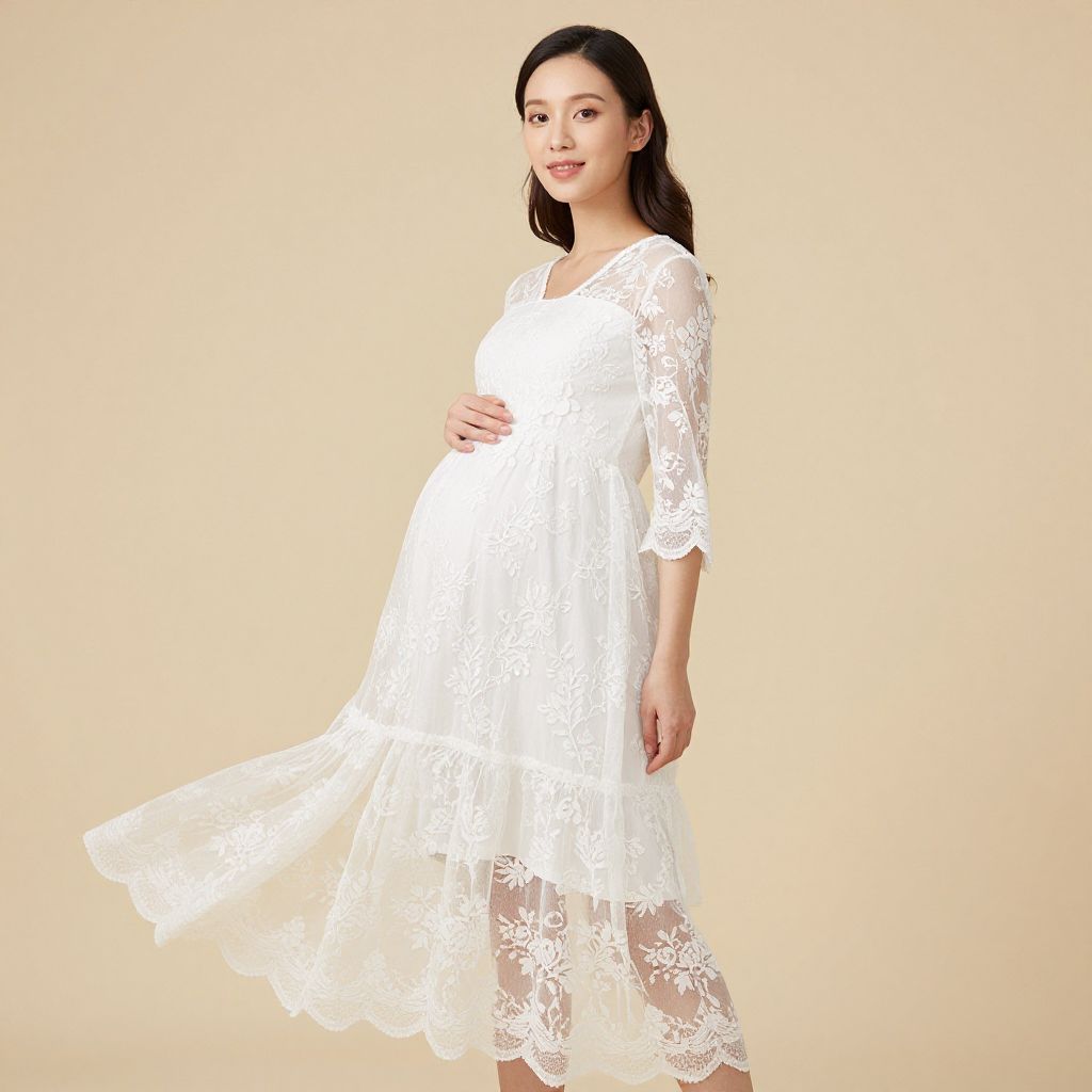Pregnant woman gracefully posing in a delicate white lace dress featuring floral embroidery, three-quarter sleeves, and a flowing silhouette against a soft beige backdrop.