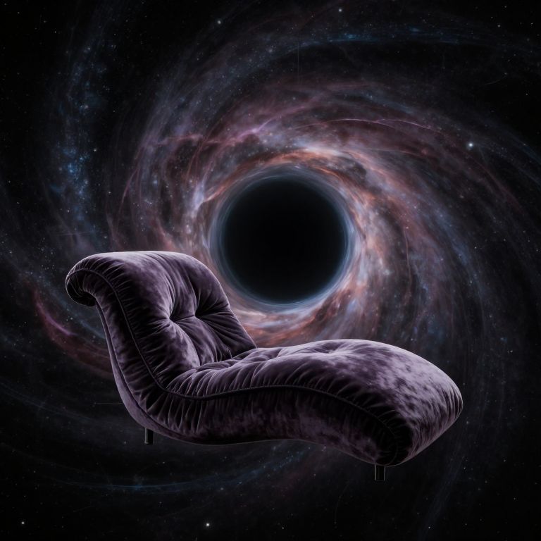 Suspended in the cosmic void, a plush velvet chaise lounge invites contemplation amidst the swirling chaos of a black hole, where the weightless embrace of serenity contrasts with the infinite pull of existential mystery.