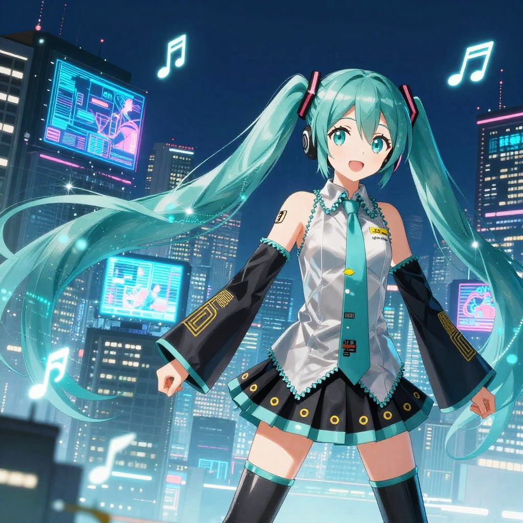 Hatsune Miku computer wallpaper, stylized anime art, futuristic city skyline at night with holographic billboards, vivid blue and green glowing lights, Miku’s iconic twin tails flowing in digital wind, musical symbols floating around, high detail and rich color depth.
