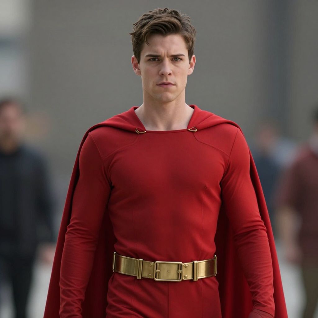 Young justice costume, 1boy, solo, male focus, cape, boots, full body, armor, brown hair, standing, belt, gloves, looking at viewer, superhero, red footwear, realistic, fingerless gloves, clenched hands