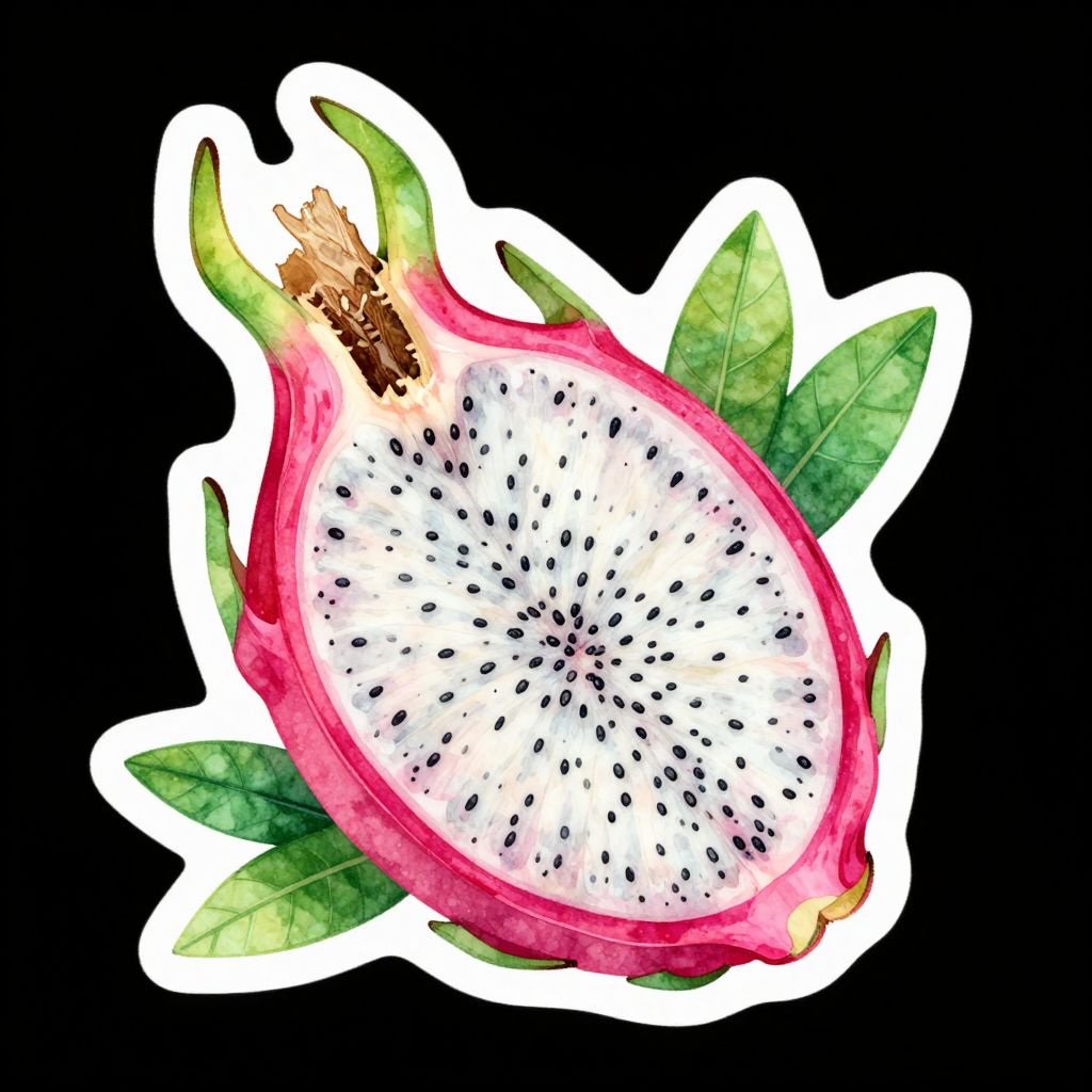 Digital artwork of a detailed dragon fruit sticker design featuring vibrant pink, white, and green colors. The design is hand-drawn and rendered in watercolor style with sharp focus and a materialistic flat icon aesthetic. The image showcases the dragon fruit with realistic textures and seeds, surrounded by green leaves, against a solid black background.