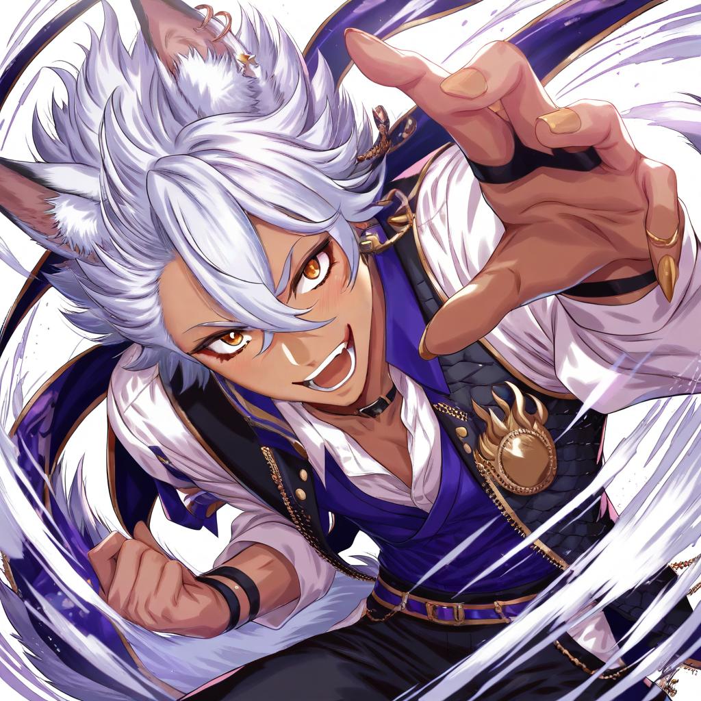 Jack howl, twisted wonderland, 1boy, wolf boy, dark-skinned male, wolf ears, wolf tail, animal ear fluff, yellow eyes, short hair, white hair, by artist sakiyamama, animagine