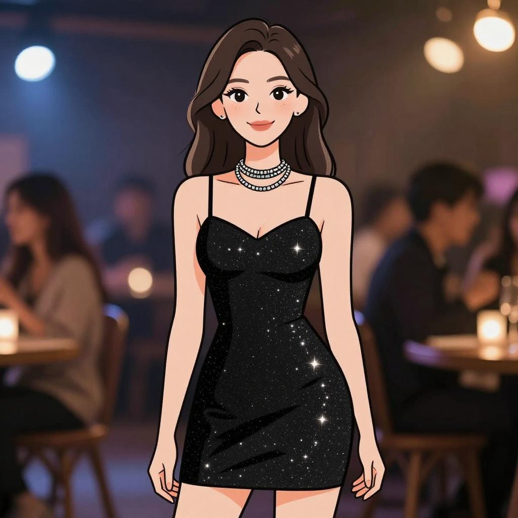 This digital illustration depicts a fair-skinned woman with long, wavy brown hair and large, expressive eyes. She is wearing a sparkly, black, strapless mini dress that accentuates her slender figure and ample bust. A multi-strand pearl necklace adorns her neck. The background shows a dimly lit restaurant with blurred, out-of-focus patrons seated at wooden tables, illuminated by warm, glowing lights. The woman stands confidently in the foreground, smiling slightly, with a soft, cartoonish style that emphasizes her elegant and attractive appearance.