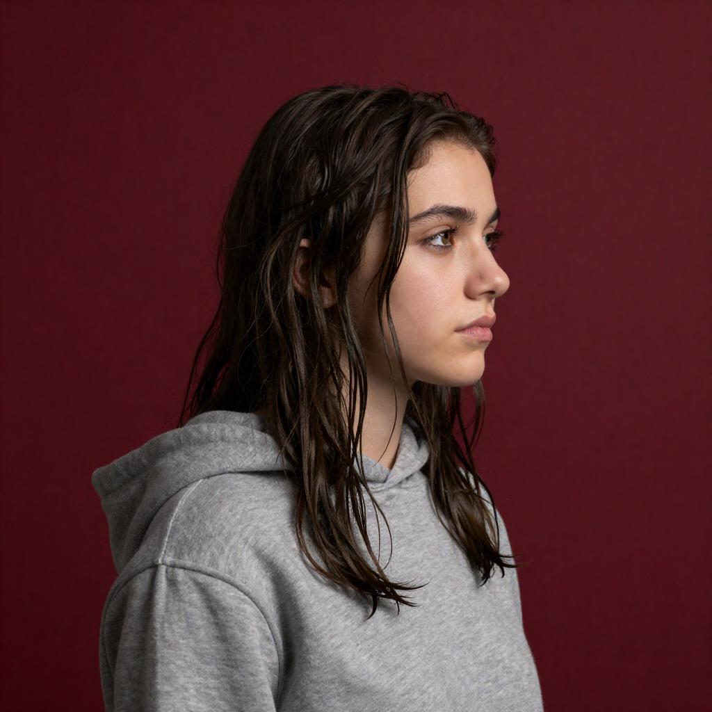 Photograph of a woman with pale skin and dark hair, profile view, wearing a gray sweater, intense gaze. Red background. Traffic light with red signal on the left. Red car in the foreground. Urban setting.