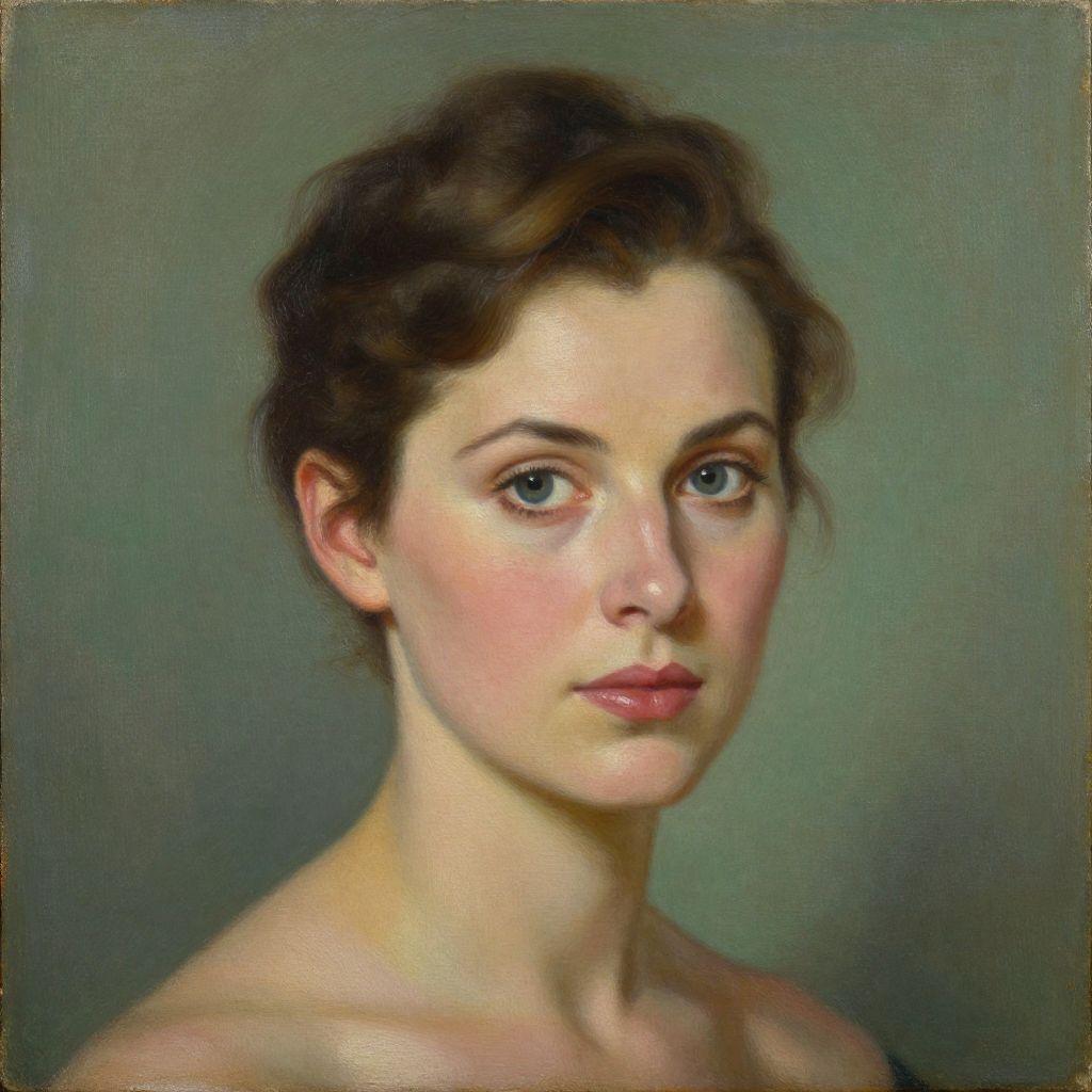 Realistic digital painting of a fair-skinned woman with blue eyes, brown wavy hair, and pink lips, against a muted green background.