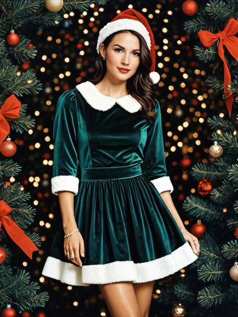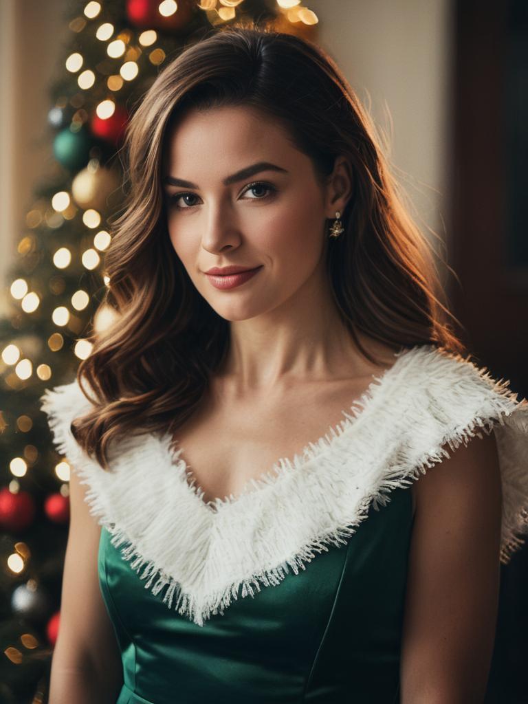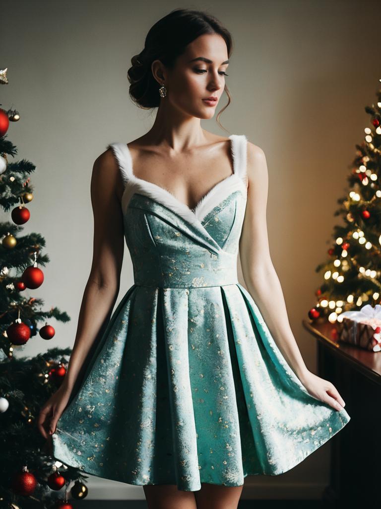 Woman in Christmas Party Dress, cinematic realism, festive editorial fashion shot --sref 1388