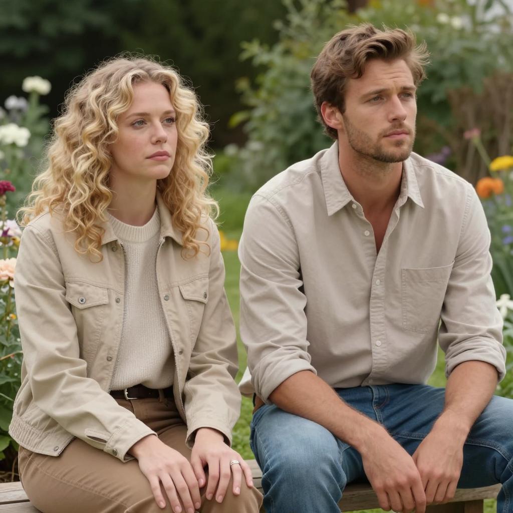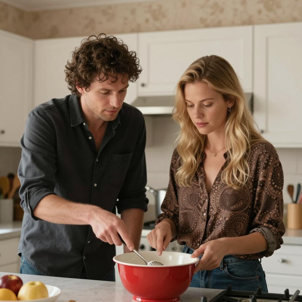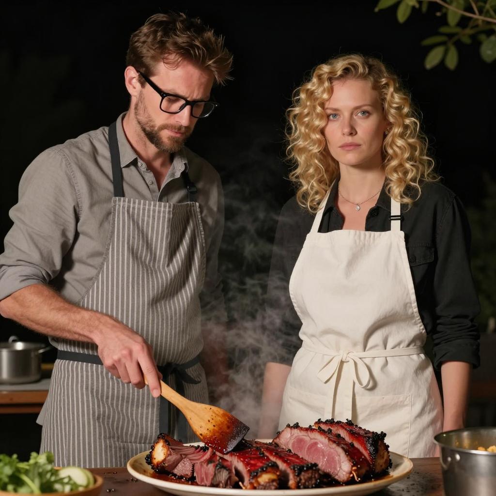 Photograph of a man and woman at night, cooking outdoors. Man with glasses, striped apron, holding a wooden spatula. Woman with curly blonde hair, white apron, black jacket, serious expression. Large plate of cooked red meat in foreground. Dark background with foliage. Man looking down, woman looking forward. Both standing.