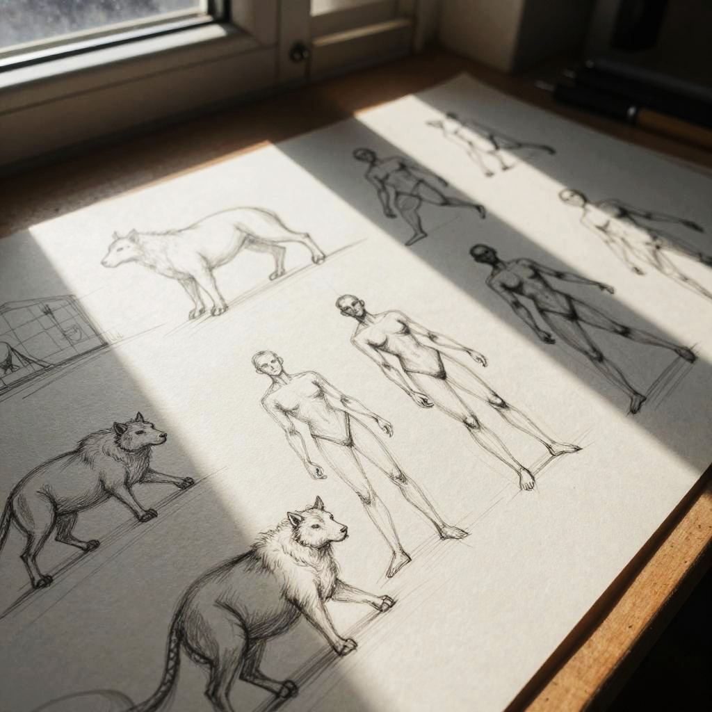 Warm up sketch generator scene showing an artist's desk with multiple rough sketches of animals and human figures in motion, natural sunlight streaming through a window, warm tones, textured paper, and loose, expressive pencil strokes conveying spontaneity.