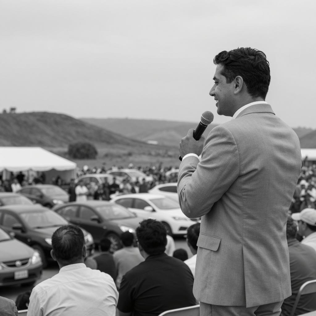 Black-and-white photograph of a man in a light-colored suit standing in profile, holding a microphone, speaking to a large outdoor crowd. He has short, dark hair, and is smiling. In the background, numerous cars are parked in rows, and a large tent is visible. Another person is partially visible in the foreground, seated and facing away. The landscape in the background is dry and hilly. The crowd is densely packed, with hundreds of people.